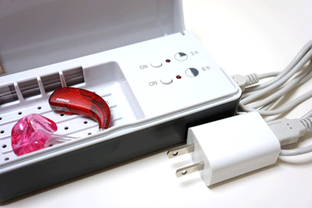 補聴器を使用しない就寝時などは、この「D-DRY」(デイードライ)などの乾燥器に入れて、汗や湿気から補聴器を守るようにしてください。